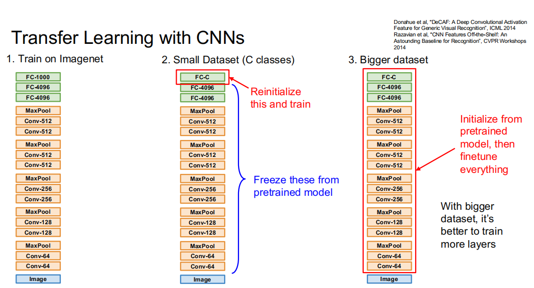 在相似数据集上训练完后,我们得到了一个具有良好特征提取能力的卷积层和全连接层。接下来要在小数据集上进行训练,以此图为例,从一个1000分类问题变成了一个小数据集上的C分类问题。此时前面的层已经有了较好的特征提取性能,使用小数据集训练未必能得到提升,因此只将最后一层FC-1000换成FC-C,然后固定其他层,只用小数据训练最后一层FC-C,就得到了一个C分类的神经网络。当然,如果有较大的数据集,也完全可以直接训练整个网络,提高模型在特定数据集上的表现。