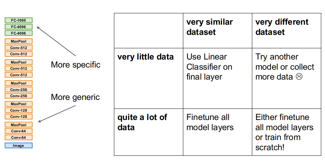 有时我们并没有大量带标签的数据,这种情况下仅使用少量的数据进行训练是远远不够的。这个时候就需要先使用其他相似的数据集(如ImageNet)进行预训练——虽然相似数据集与小数据集的数据未必相同,但是通过使用大数据集的训练,可以使得神经网络有较强的特征提取和泛化能力(有点期末周刷卷子拟合的感觉了)。