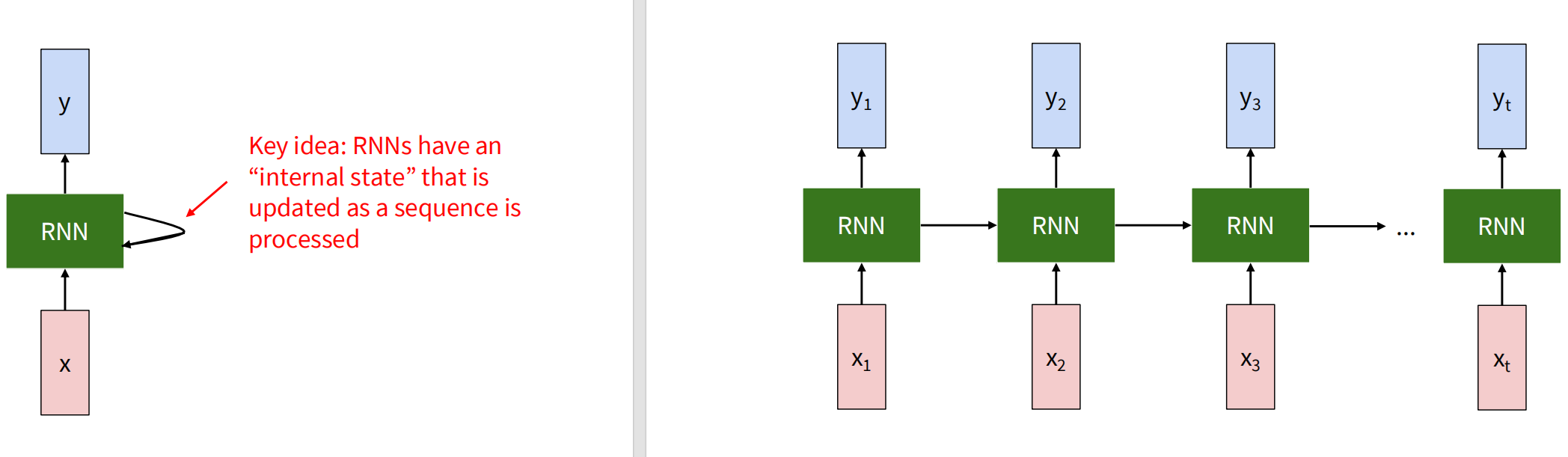 左侧是循环神经网络的单元,中间的隐藏状态随着序列处理更新,可以展开成类似右侧的形式。隐藏状态通过 ht=fW(ht1,xt)h_t = f_W(h_{t-1}, x_t) 来更新,其中 WW 是变换的参数;输出则通过当前时间步的隐藏状态得到,即 yt=fWhy(ht)y_t = f_{W_{hy}}(h_t) 得到。每个时间步使用变换的参数如 WWWhyW_{hy} 在序列处理的各个时间步都是共享的。