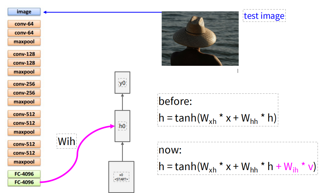 使用RNN进行图像描述时,先使用卷积神经网络将图像编码成一个定长的向量,然后将这个向量作为循环神经网络的输入来生成描述文本。不过计算隐藏状态的方法发生了改变,增加了一个矩阵 WihW_{ih} 来处理将图像输入加到隐藏状态的计算中。后续的传播就是将每一个时间步的输出作为下一时间步的输入重复,直到生成结束token。