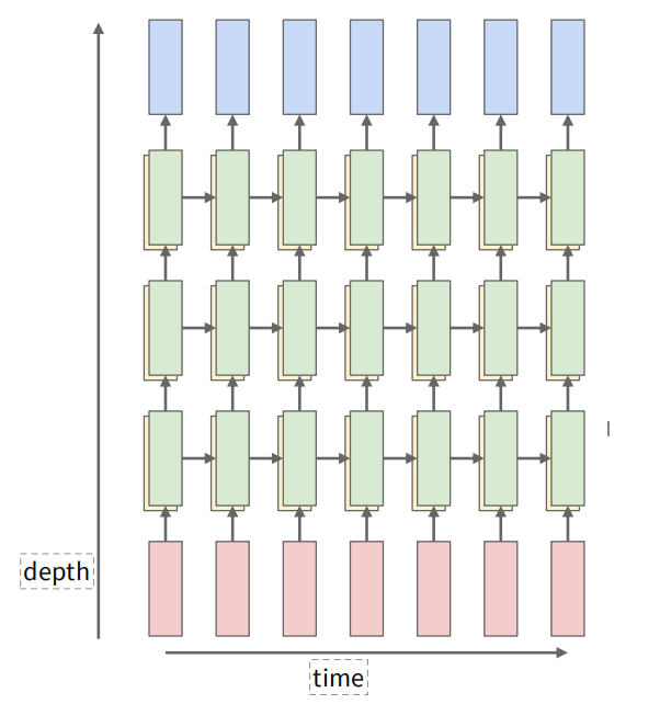 可以增加中间隐藏层的层数来提升模型的表达能力,这样每个时间步的计算就变成了多层的前向传播。对于每一层的隐藏状态计算,输入是上一层的隐藏状态和当前时间步的输入。这一部分课上似乎没有深究。